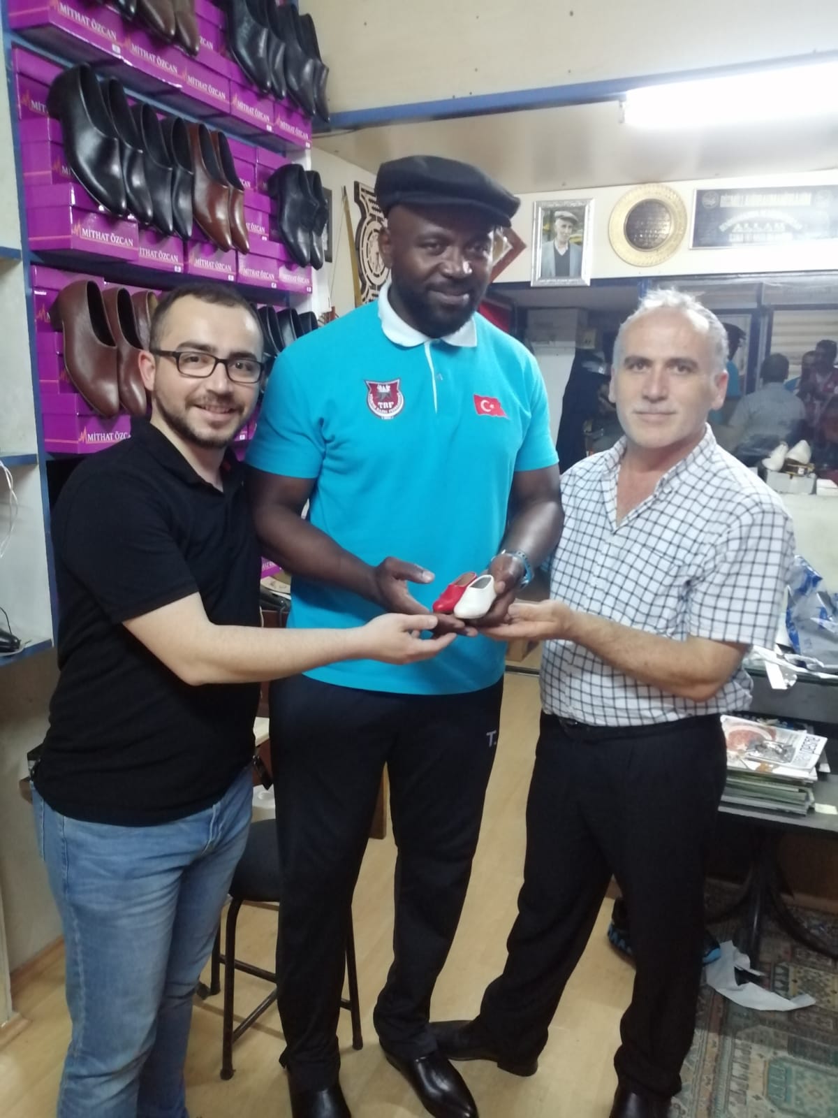 Cherokee SYLVAIN NGUE’in ziyaretinden çok memnun kaldıklarını belirten Mithat Kundura’nın sahibi Mithat ÖZCAN tecrübeli antrenöre kırmızı beyaz renklerinde mini Çarşamba ayakkabısı ile sekiz köşe kasket hediye etti.